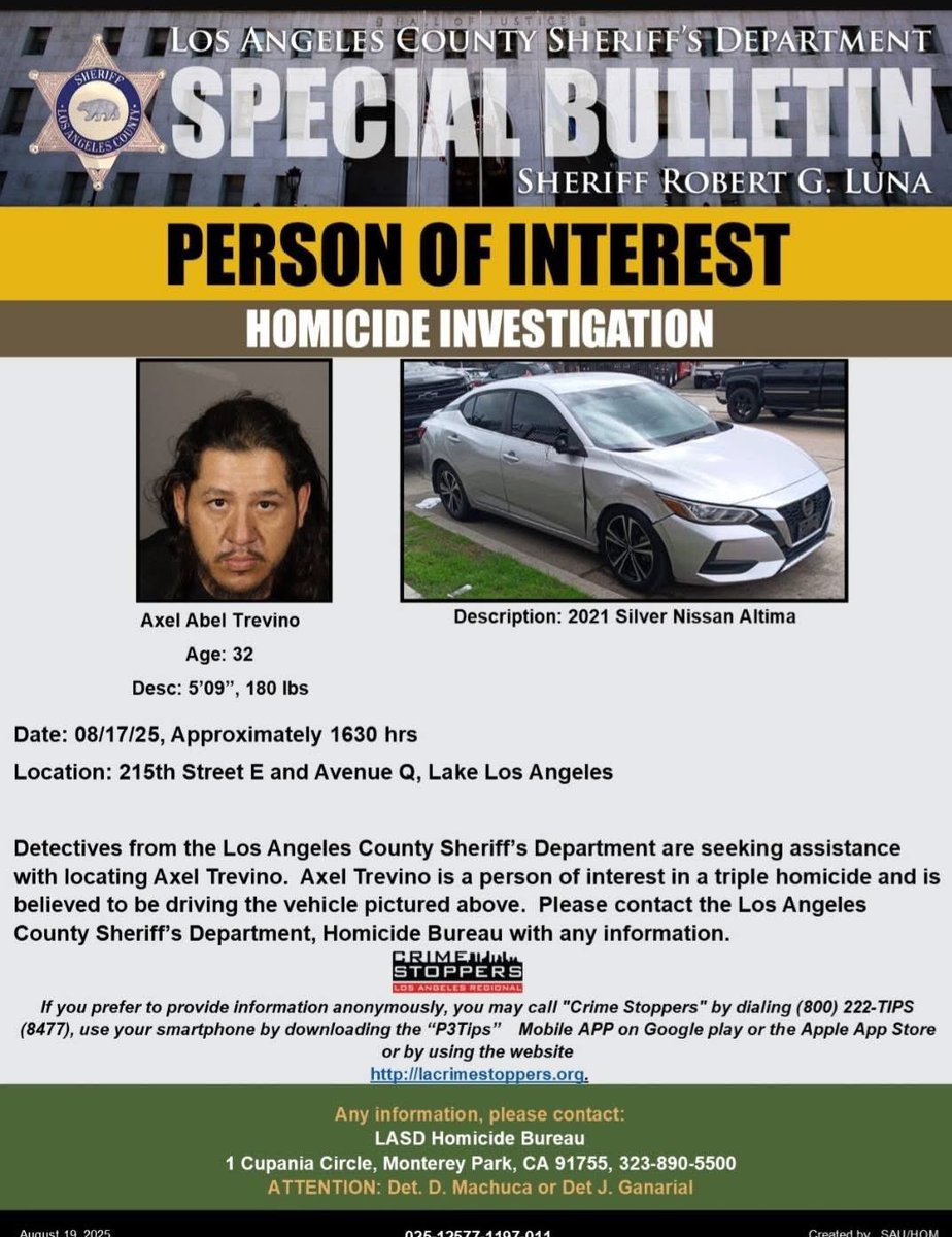 By Tuesday, August 19, 2025, the investigation took a sharp turn. Sheriff’s homicide detectives zeroed in on a person of interest: 32-year-old Axel Abel Trevino. Described as 5 feet 9 inches tall and weighing around 180 pounds, Trevino is now the focal point of a manhunt that has gripped the Antelope Valley. Authorities believe he was last seen driving a silver 2021 Nissan Altima near the crime scene at 215th Street East and Avenue Q. A photo of the vehicle, released by the Sheriff’s Department, reveals a telling detail: visible damage to the passenger-side front quarter panel, a clue that could lead to a breakthrough. The public has been urged to keep a sharp eye for Trevino or his car, with warnings that he may be armed and dangerous. “Do not approach,” officials caution, directing anyone with information to contact the LASD Homicide Bureau at 323-890-5500 or submit anonymous tips through Crime Stoppers at 800-222-8477 or lacrimestoppers.org.
