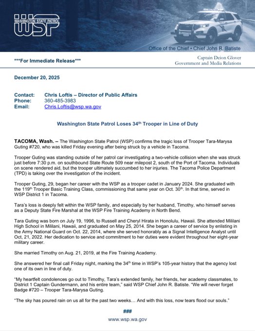 The Washington State Patrol (WSP) confirms the tragic loss of Trooper Tara-Marysa Guting #720, who was killed Friday evening after being struck by a vehicle in Tacoma. pic.twitter.com/9kAmL5rAI1