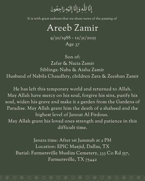 Dallas — Early on New Year’s Eve morning, the Dallas area woke to heartbreaking news: Dr. Areeb Zamir, 37, a well-loved pulmonologist from Garland, Texas, was found dead on U.S. Highway 75 in Dallas after a tragic crash that also claimed two others.