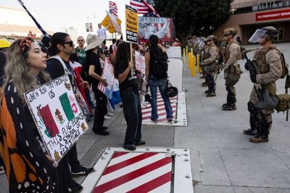 article Demonstrators face a mix of US marines, national guards and Department of Homeland Security police officers standing guard as they protest in front of the Metropolitan Detention Center followi...